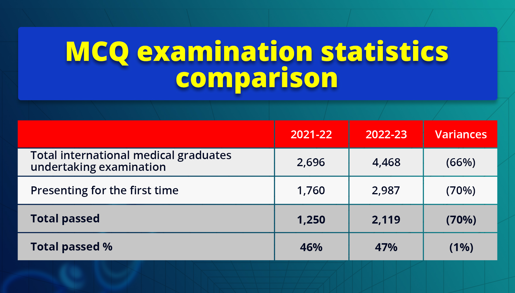 The pass percentage for the MCQ exam slightly increased from 46% to 47%. This marginal improvement indicates a consistent difficulty level, with a substantial rise in the number of candidates sitting the exam.