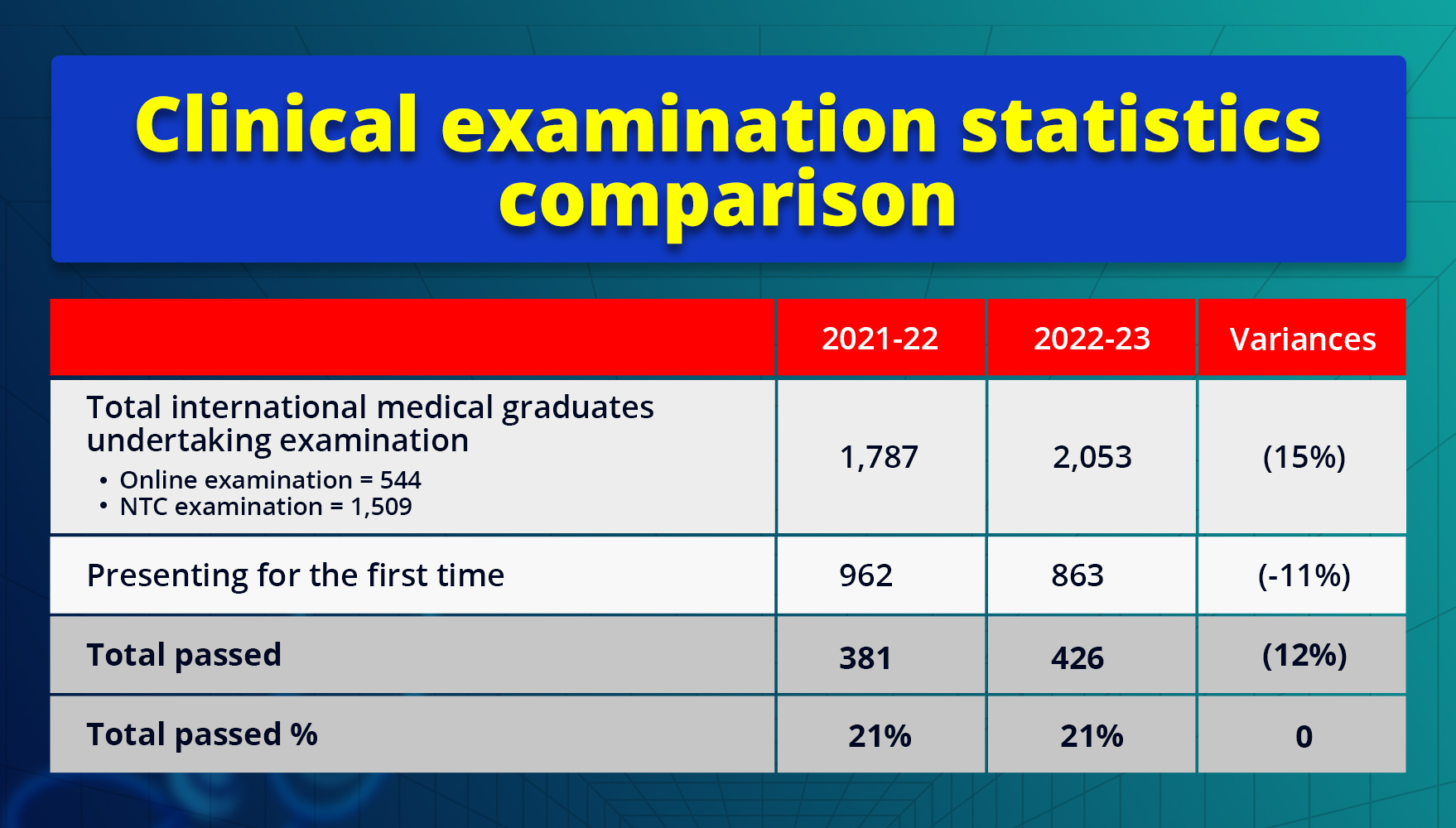 The pass rates have remained the same for the two consecutive years. However, we can see that the number of candidates decreased from 2021 to 22.