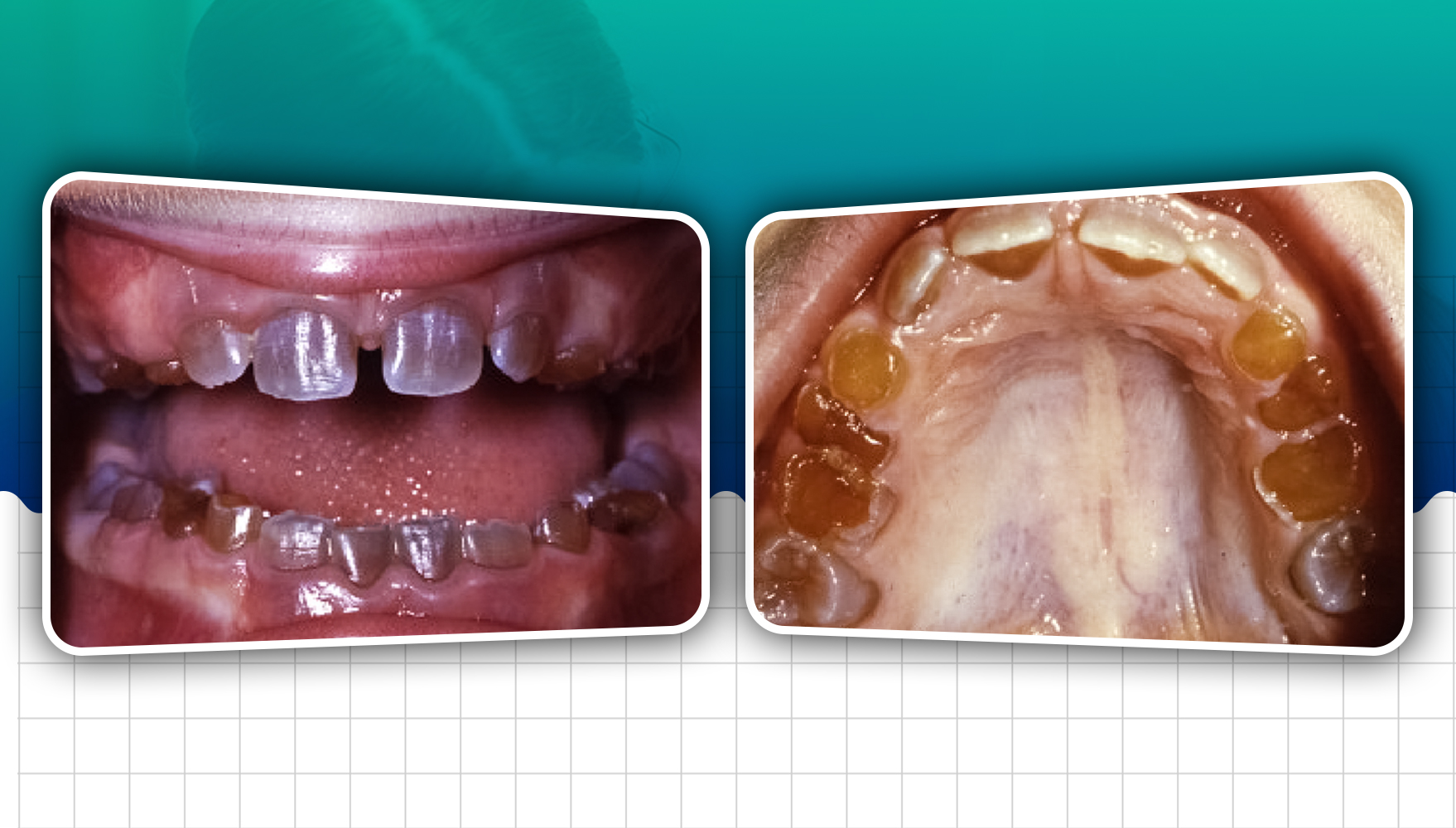 - Shell teeth: In Brandywine type, the tooth's enamel appears normal, while the dentin is extremely thin, and the pulp chambers are enormous. Teeth appear as 'shell teeth'. In addition, the tooth's roots are extremely short, so it seems as if enamel and dentin are surrounded by extremely large pulp chambers and root canals.