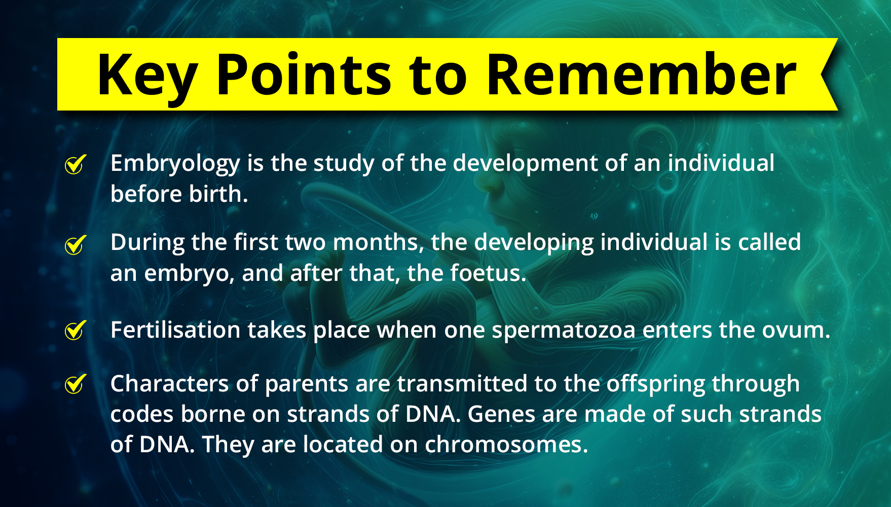Embryology is the study of the formation and development of the embryo (or foetus) from the moment of its inception up to the time when it is born as an infant.