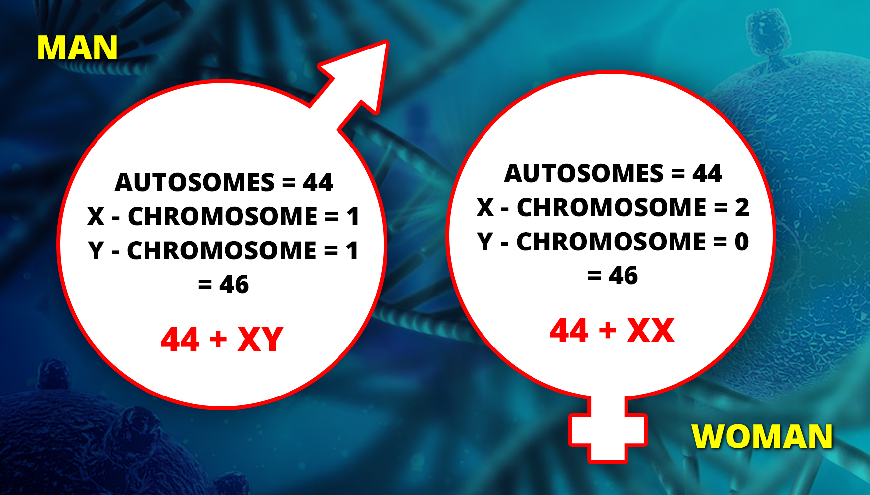 The forty-six chromosomes in each cell can be divided into forty-four autosomes and two sex chromosomes. The sex chromosomes may be of two kinds: X or Y. In a man, there are forty-four autosomes, one X chromosome and one Y chromosome; in a woman, there are forty-four autosomes and two X chromosomes in each cell. The forty-four autosomes consist of twenty-two pairs, the two chromosomes forming a pair identical (homologous chromosomes). In a woman, the two X-chromosomes form another such pair; in a man, this pair is represented by one X- and one Y-chromosome. One chromosome of each pair is derived from the mother and the other from the father.